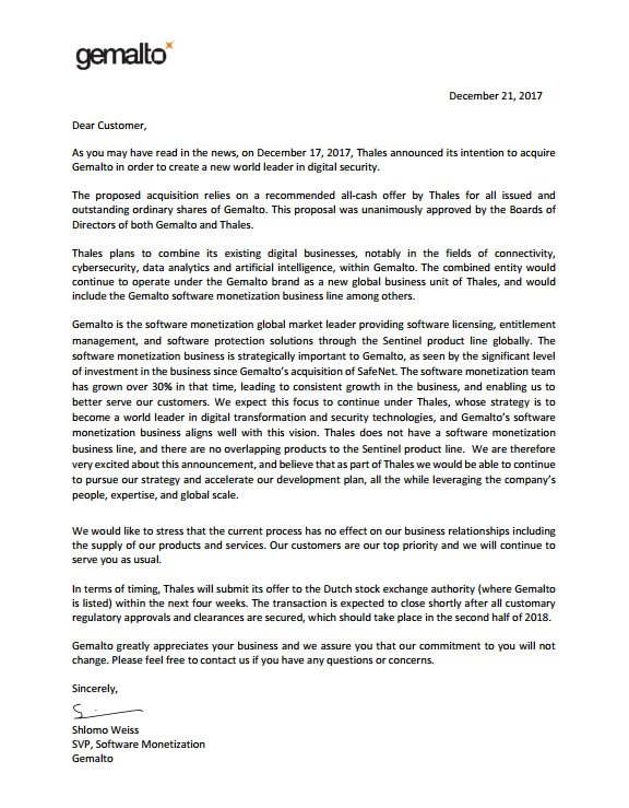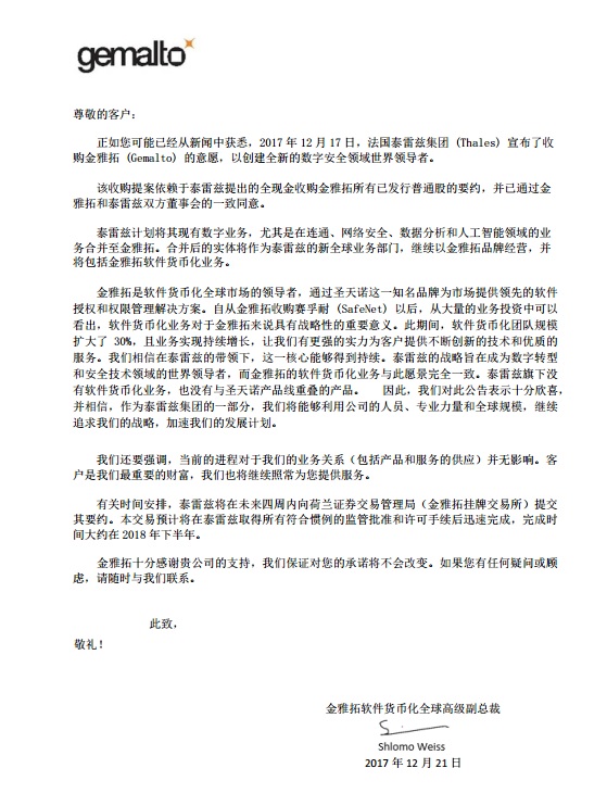 致用戶公開信-法國泰雷茲集團 (Thales) 宣布了收購金雅拓 (Gemalto) 的意愿