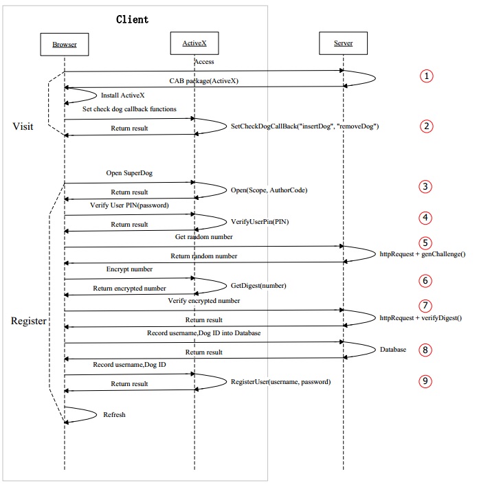 9. 數據庫寫入成功后,調用 ActiveX 控件的 RegisterUser(username, PIN)方法,把注冊信息寫入到超級狗里。
