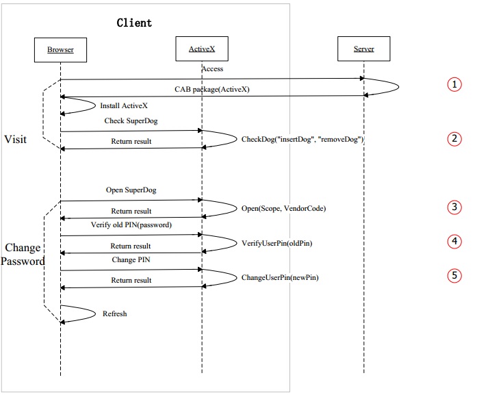 4. 頁面的 javascript 代碼調用控件的 VerifyUserPin(PIN) 方法,驗證用戶輸入的舊口令與超級狗中的口令是否一致。