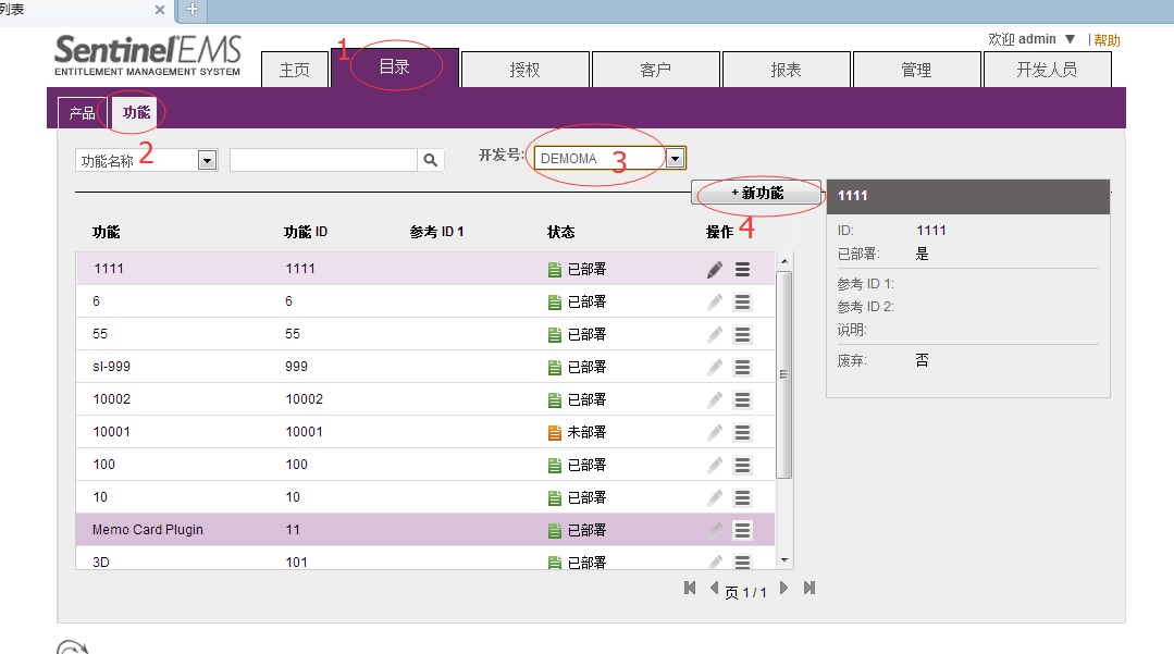 按圖中1目錄,2功能,3選擇開發號,4新建功能這樣的步驟操作