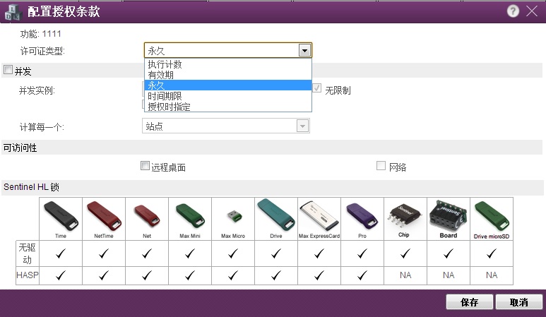 添加的功能默認是永久,單機屬性,如果要設置軟件使用次數、時間、以及網絡并發用戶數,就在添完功能后點“配置”。