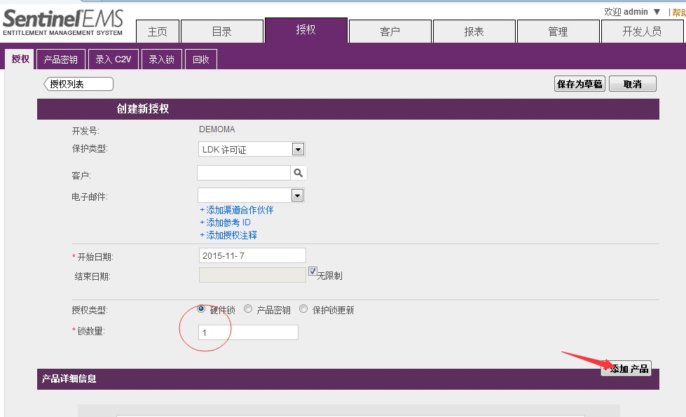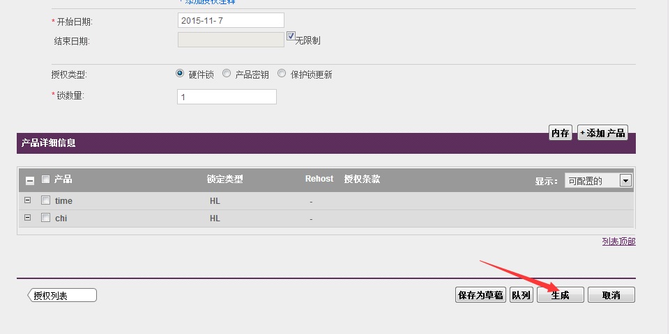 填入要寫鎖的數量,并通過“添加產品”把之前定義好的產品添加進來。