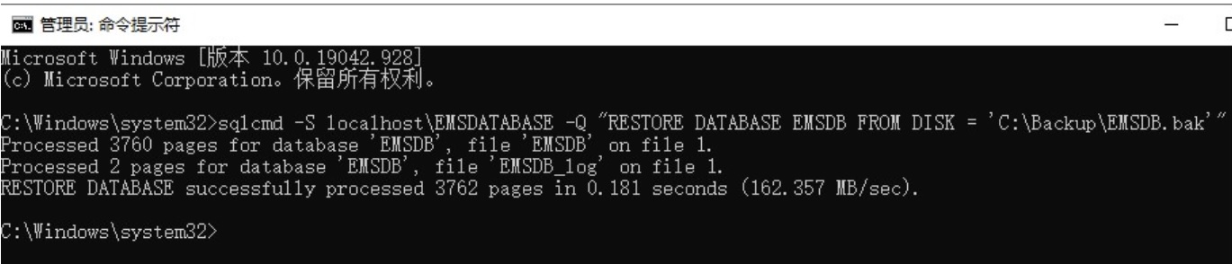 4) 輸入命令 sqlcmd -S localhost\EMSDATABASE -Q "RESTORE DATABASE EMSDB FROMDISK = 'C:\Backup\EMSDB.bak' with replace"