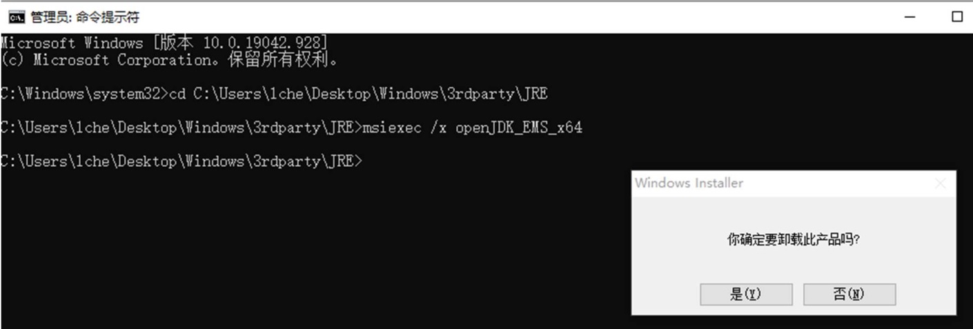 以管理員權(quán)限打開 cmd.exe,進(jìn)入到 LDK 8.2 安裝包的 \Windows\3rdparty\JRE 路徑下,輸入命令 msiexec /uninstall openJDK_EMS_x64 或 msiexec /x openJDK_EMS_x64。