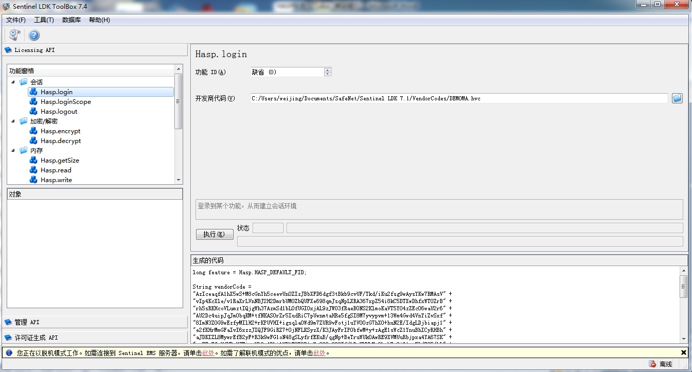 1、C#開發語言的修改過程:用記事本打開正式號密鑰文件xxxxx.hvc,把內容全部復制,找到示例目錄中的dogvendorcode.cs文件,把hvc文件中的內容替換到“private const string vendorCodeString =”后面的引號中,再把正式號的庫文件hasp_windows_xxxxx.dll拷到bin就可直接編譯測試,無需在代碼中對此DLL做引用。