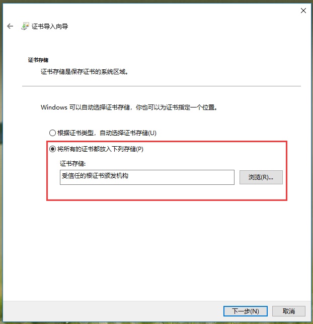 3、選擇“將所有證書放入以下存儲中(Place all Certificates in the following store)” > 點擊“瀏覽” > 選擇“受信任的根證書頒發機構(Trusted Root Certification Authorities)” > 點擊“確定” > 然后點擊“下一步”;