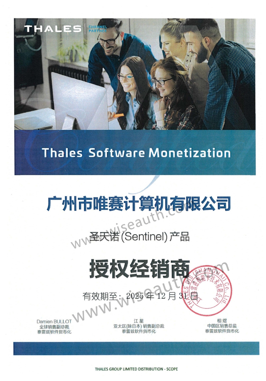 廣州市唯賽計算機有限公司成立于2003年,公司致力于為軟件開發(fā)商提供軟件保護(hù)解決方案和為企業(yè)提供企業(yè)管理信息安全的解決方案,是法國泰雷茲(THALES)和賽孚耐(SAFENET)公司中國區(qū)核心的代理商。公司主要經(jīng)營的產(chǎn)品有軟件加密狗、圣天諾加密鎖等各類 軟件貨幣化解決方案;u-key身份認(rèn)證令牌;物聯(lián)網(wǎng)軟件 嵌入式解決方案以及泰雷茲公司的全系列網(wǎng)絡(luò)安全產(chǎn)品。